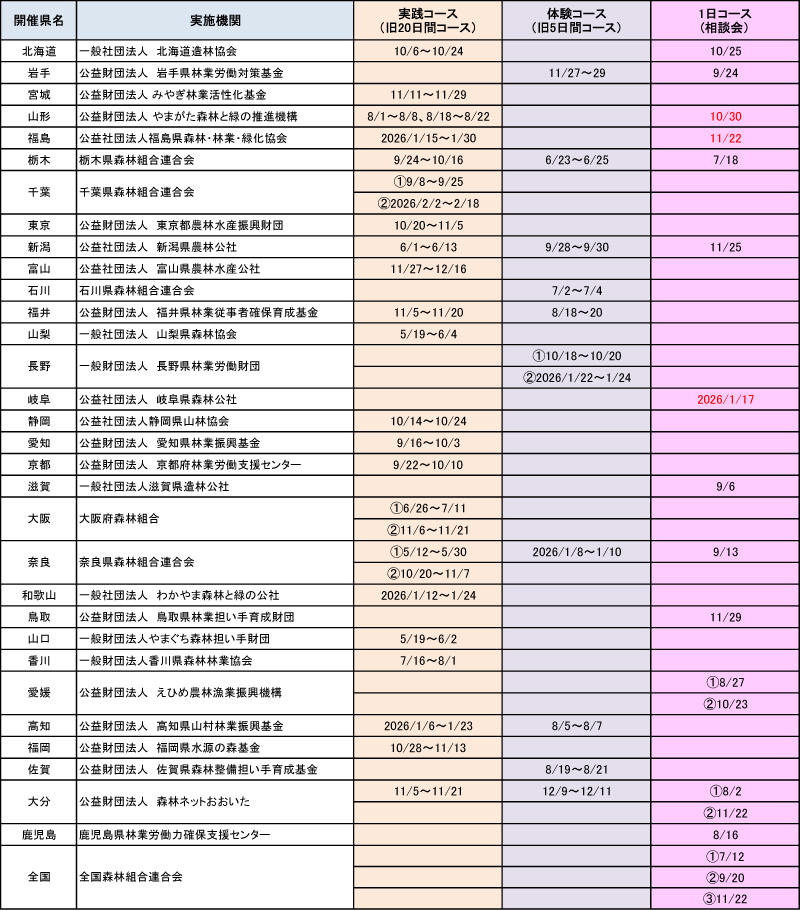 林業就業支援講習一覧 ※日程は今後変更となる場合があります。詳細は各地域の林業労働力確保支援センターにお問い合わせください。 相談窓口・連絡先 支援講習日程 ※2025年10月時点の予定です。日程は今後変更になる場合があります。 ※詳細については、各都道府県の【相談窓口】にお問い合わせください。 【相談窓口・問い合わせ先】 北海道エリア 東北エリア 関東エリア 北陸エリア 東海エリア 近畿エリア 中国エリア 四国エリア 九州・沖縄エリア 林業就業希望者向け 林業就業支援講習の案内林業就業支援講習一覧実践コース(旧20日間コース)体験コース(旧5日間コース)林業就業相談会(1日コース)受講生の声お知らせ